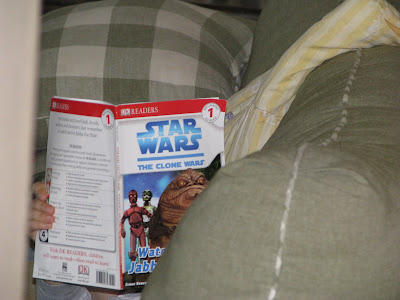 Superman reading a Clone Wars book out loud, ignoring the cartoon on the tv behind him.