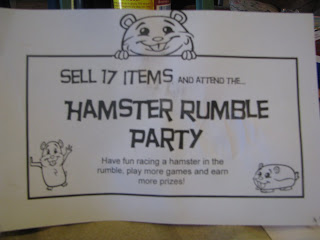 So I am flipping through this very GIANT and very HEAVY catalog and notice the page with the prize list. For every $50 dollars in sales, your child qualifies for a flourecent eraser. If he meets the $150 mark, he can join the “Hamster Rumble Party”where he’ll have fun racing a hamster in the rumble.”